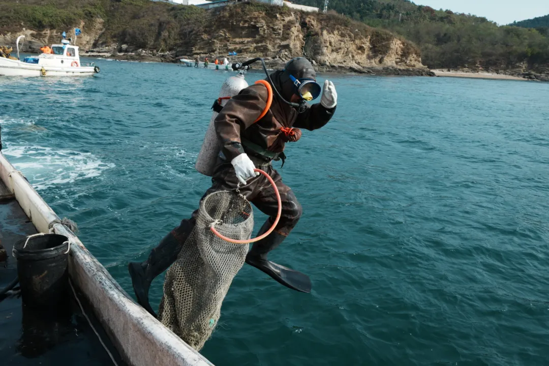 冬捕节当天,20余名潜水员庄严宣誓:“感恩生态,限量采捕”,铿锵誓言彰显了金年会官方网站入口人对海洋的敬畏与感恩。伴随着悠扬的冬捕节主题曲《采参谣》,现场气球冉冉升起、彩烟飞扬、采捕船齐声鸣笛,全副武装的潜水员们分乘捕捞船劈波斩浪,奔赴金年会官方网站入口马牙滩海域——这一闻名遐迩的纯种野生源刺参原生态栖息地。
