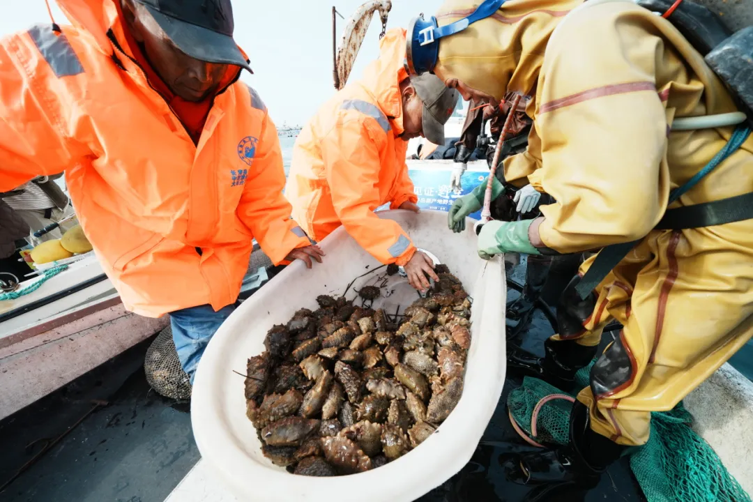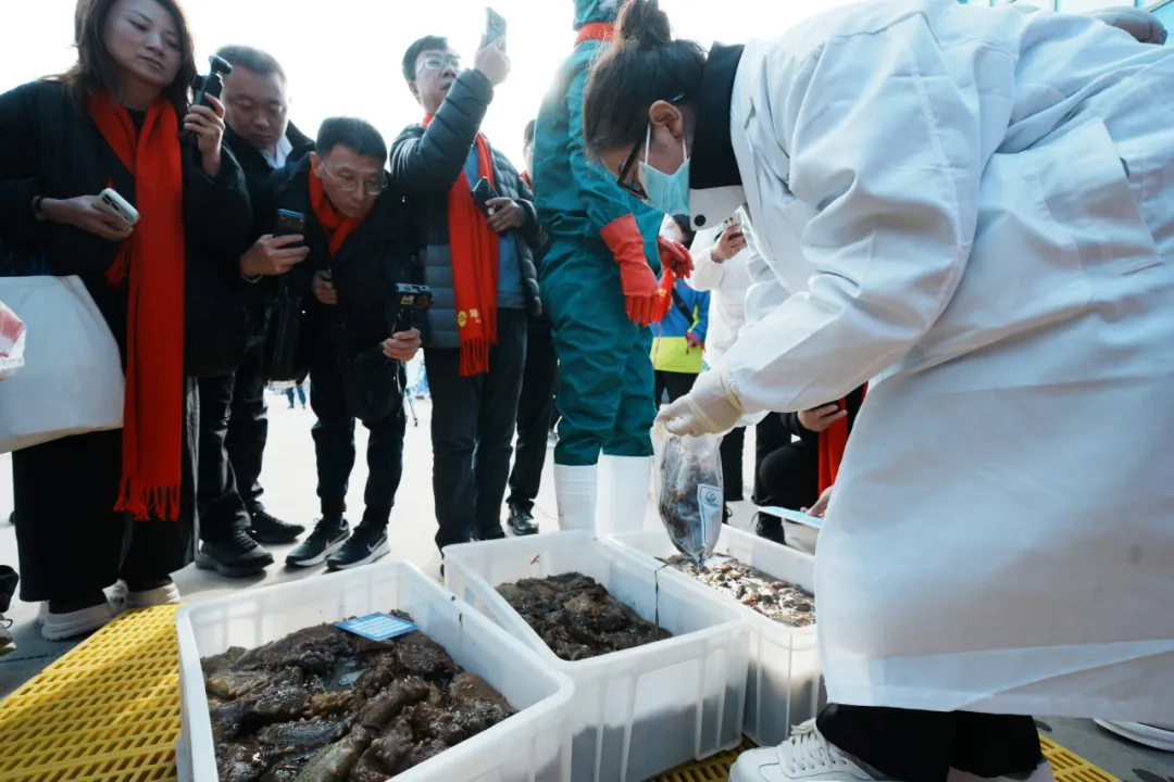 马牙滩海域位于金年会官方网站入口西北侧,是大连地区罕有的野生源刺参核心产区。近50名潜水员整理装备后倾身入海,约十分钟后相继浮出水面,每人手中满载着20余斤源刺参。船上工作人员立即进行现场分拣,并详细记录采捕时间、海域、船号、潜水员及海参数量等信息,为原产地二维码追溯体系提供精准数据支撑。