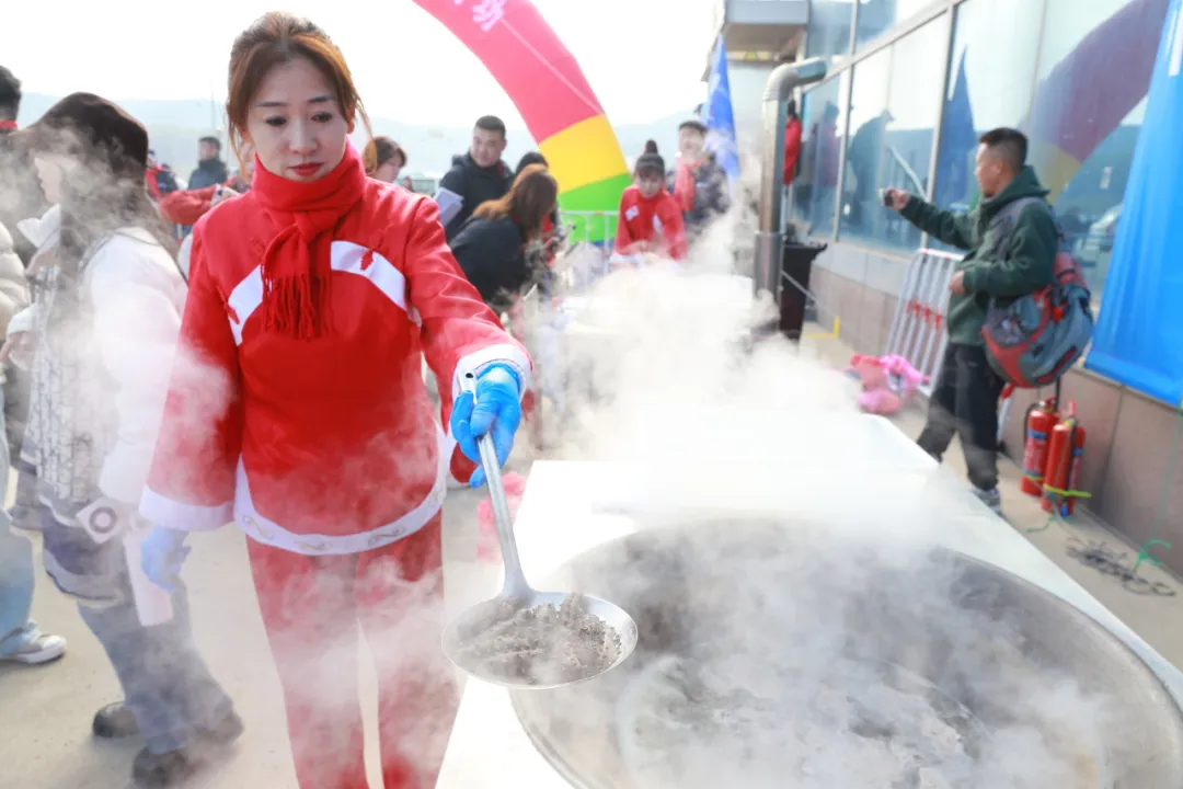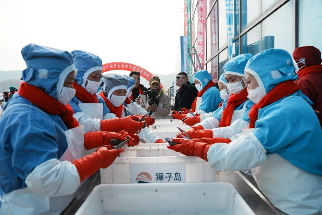 经检测的源刺参随即送至加工区,技艺娴熟的加工人员熟练地进行剖洗、去脏、清洗,随后投入岸边一字排开的四口1米多的大铁锅。灶中柴火正旺,锅中热气蒸腾,“冬捕第一锅”的烹煮场景,不仅让现场嘉宾大饱口福,更通过直播镜头让千万网友云端共鉴。