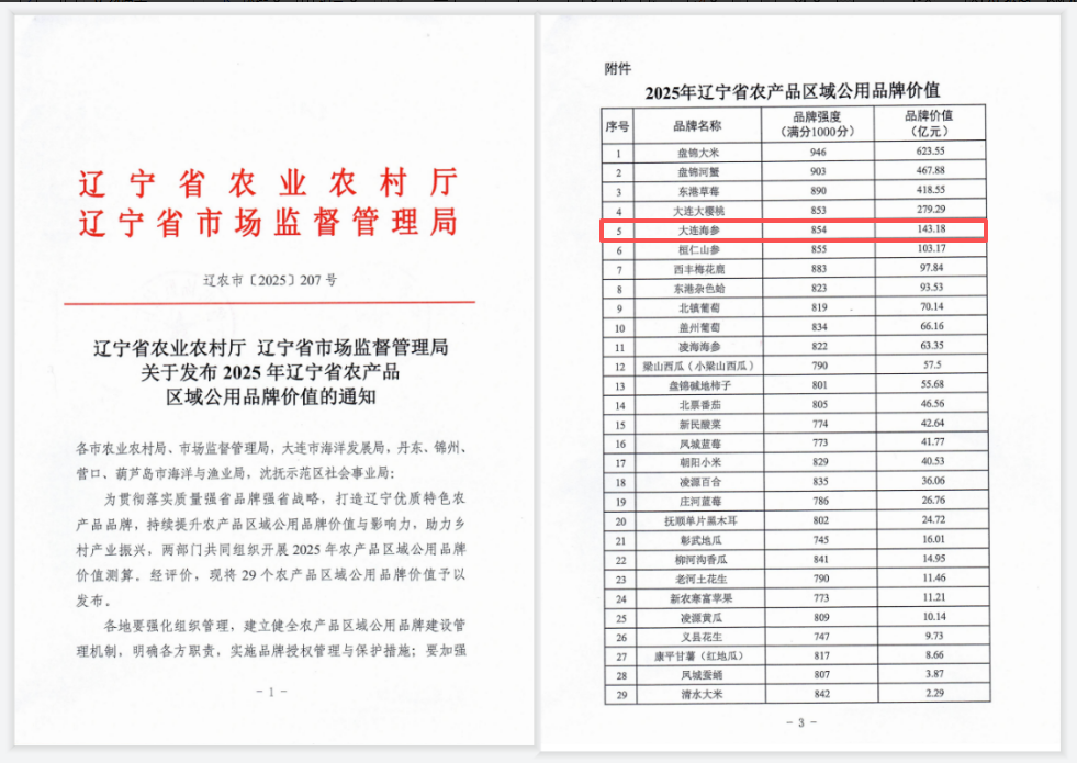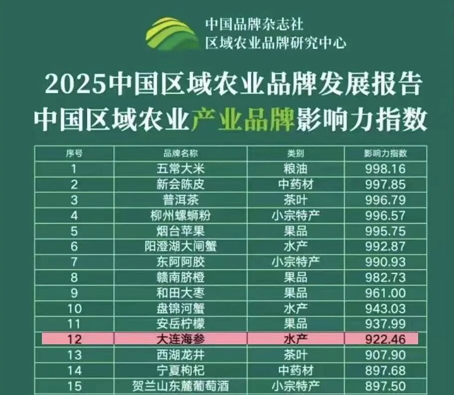 2025年12月,再次进入“2025中国区域农业品牌发展报告·中国区域农业产业品牌影响力指数100强”,大连海参稳居全国海产品影响力指数榜首。