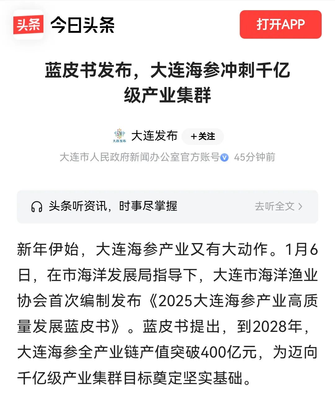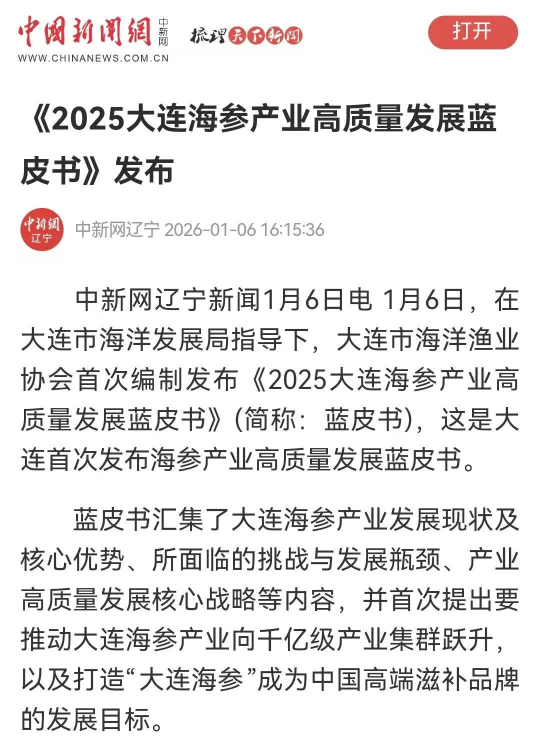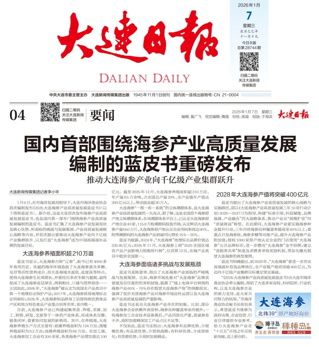 至2025年12月,大连海参已建成“育苗、养殖、采捕、加工、销售、研发、文旅”六位一体产业体系,从种源、标准、溯源、文旅等全产业链方面,形成体系完整、链条闭环、要素协同发展新格局。